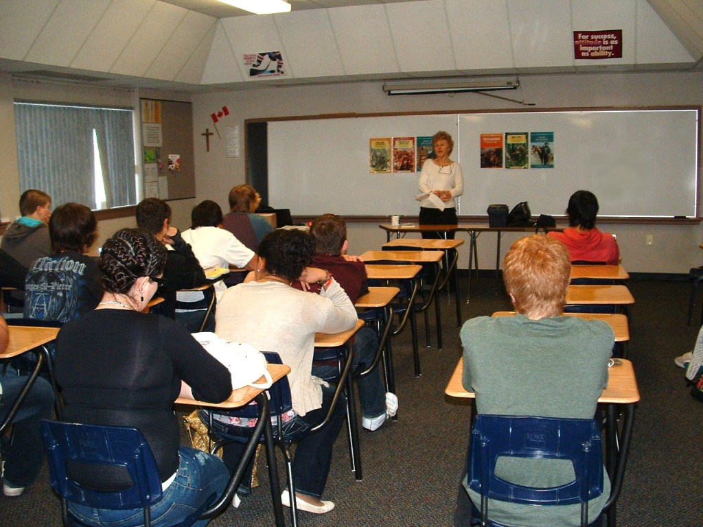 Giving a reading of People on the Move in 2011 to the grade 12 Native Studies class at John Paul II Collegiate in North Battleford, Saskatchewan. Photograph by their teacher, Gene Fauchon.